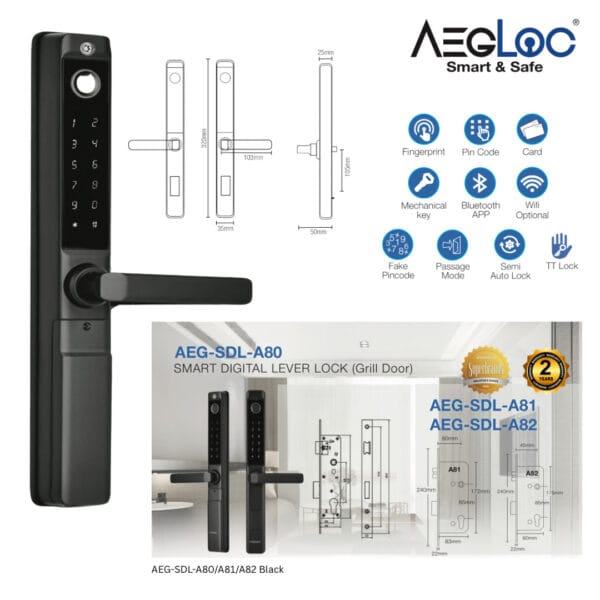The AEGLOC SMART DIGITAL LEVER LOCK (AEG-SDL-A80) is a high-security electronic lock designed for grill doors, combining advanced digital access control with robust mechanical construction. It features a smart digital keypad for PIN code entry, eliminating the need for physical keys while offering tamper-proof resistance and weatherproof durability. The lock supports multiple user codes, temporary access for guests, and an auto-locking function for enhanced security. Constructed from hardened steel, it provides drill and pry resistance, making it ideal for residential or commercial use. With options for battery-powered operation and low-battery alerts, the AEG-SDL-A80 ensures reliable protection with modern convenience. Its sleek design integrates seamlessly with grill gates while delivering keyless convenience and anti-theft safety.