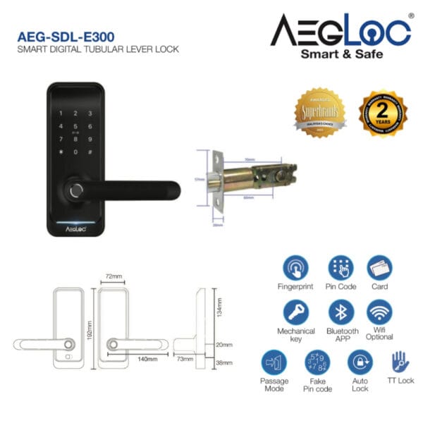 The AEGLOC SMART DIGITAL LEVER LOCK AEG-SDL-E300 is an essential, budget-friendly keyless entry system designed for users seeking basic digital convenience without complex features. It functions primarily through a simple backlit keypad for PIN code entry, allowing users to eliminate traditional keys and grant access with up to 100 unique codes. Constructed with a durable aluminium alloy faceplate. An economical choice for securing interior doors, rental properties, or as an introductory smart lock for homes.