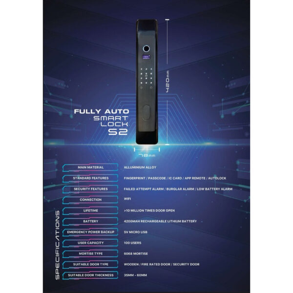 The SMARTIFY Fully Auto Smart Lock S2 is a versatile and robust keyless entry system designed for modern homes, offering a suite of convenient access methods including fast fingerprint recognition, personalized passcodes, IC cards, and remote control via a smartphone app. It ensures your door is always secure with an automatic locking (autolock) feature that engages once the door is closed. Beyond convenience, the S2 is built for security, featuring a comprehensive alarm system that triggers on failed entry attempts, detects potential forced entry, and provides warnings for low battery levels. Engineered for durability and broad compatibility, it is an ideal security upgrade for wooden, fire-rated, and security doors, providing reliable protection and smart access control without the need for traditional keys.